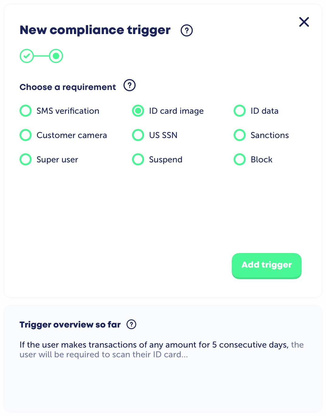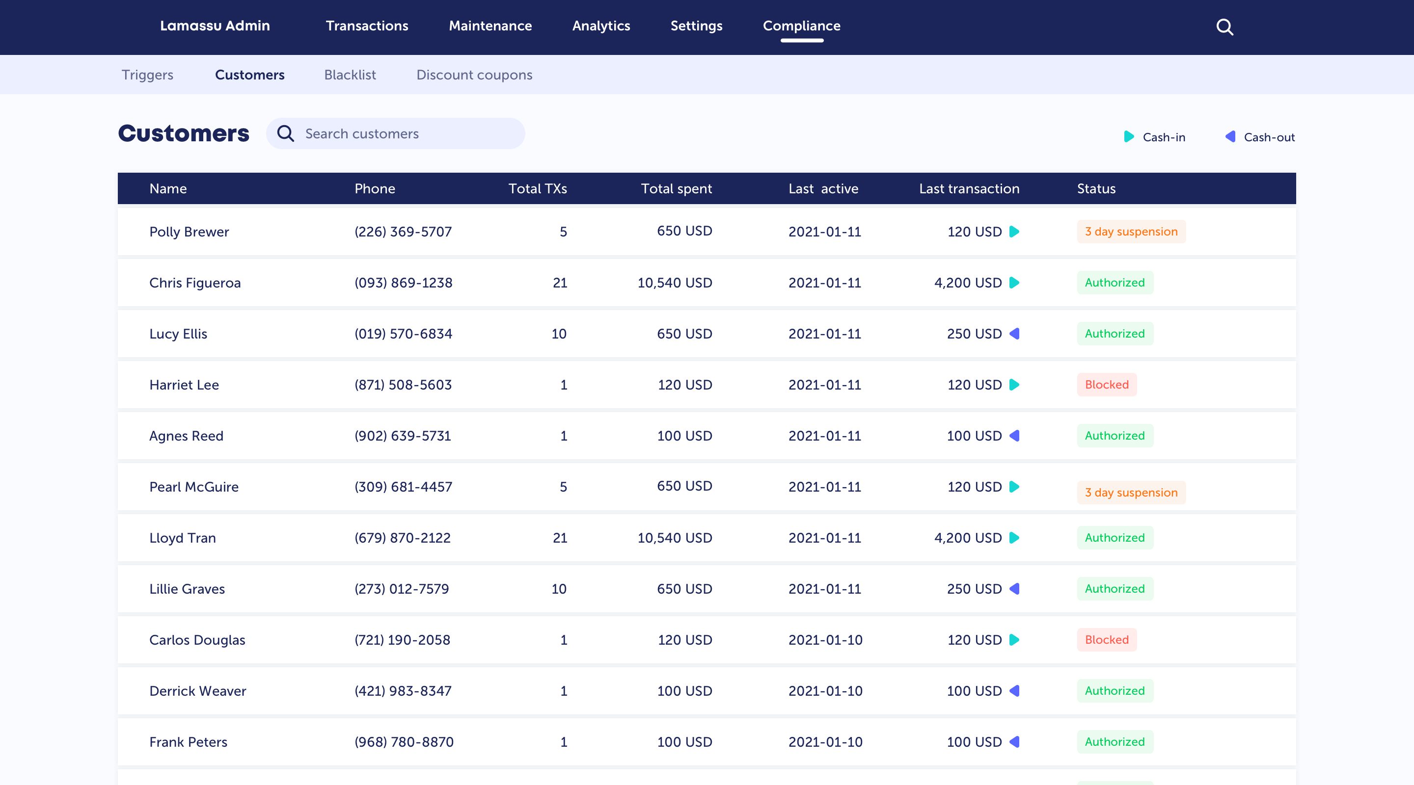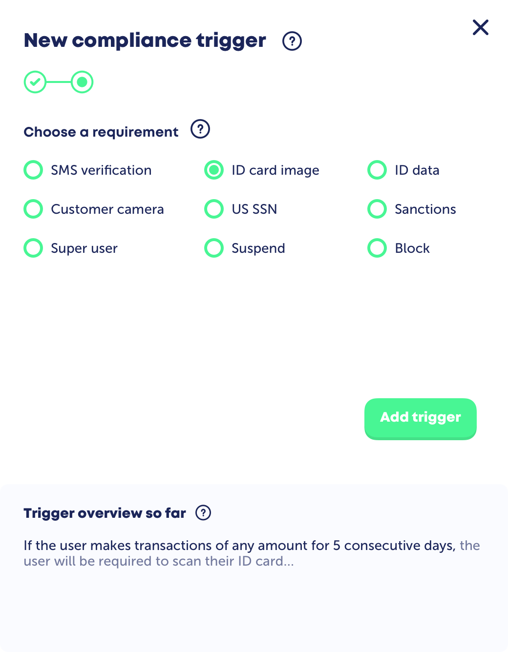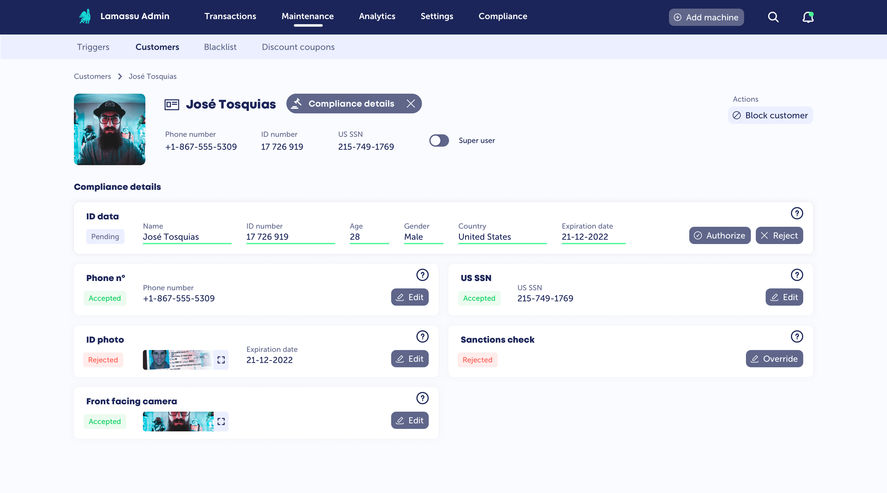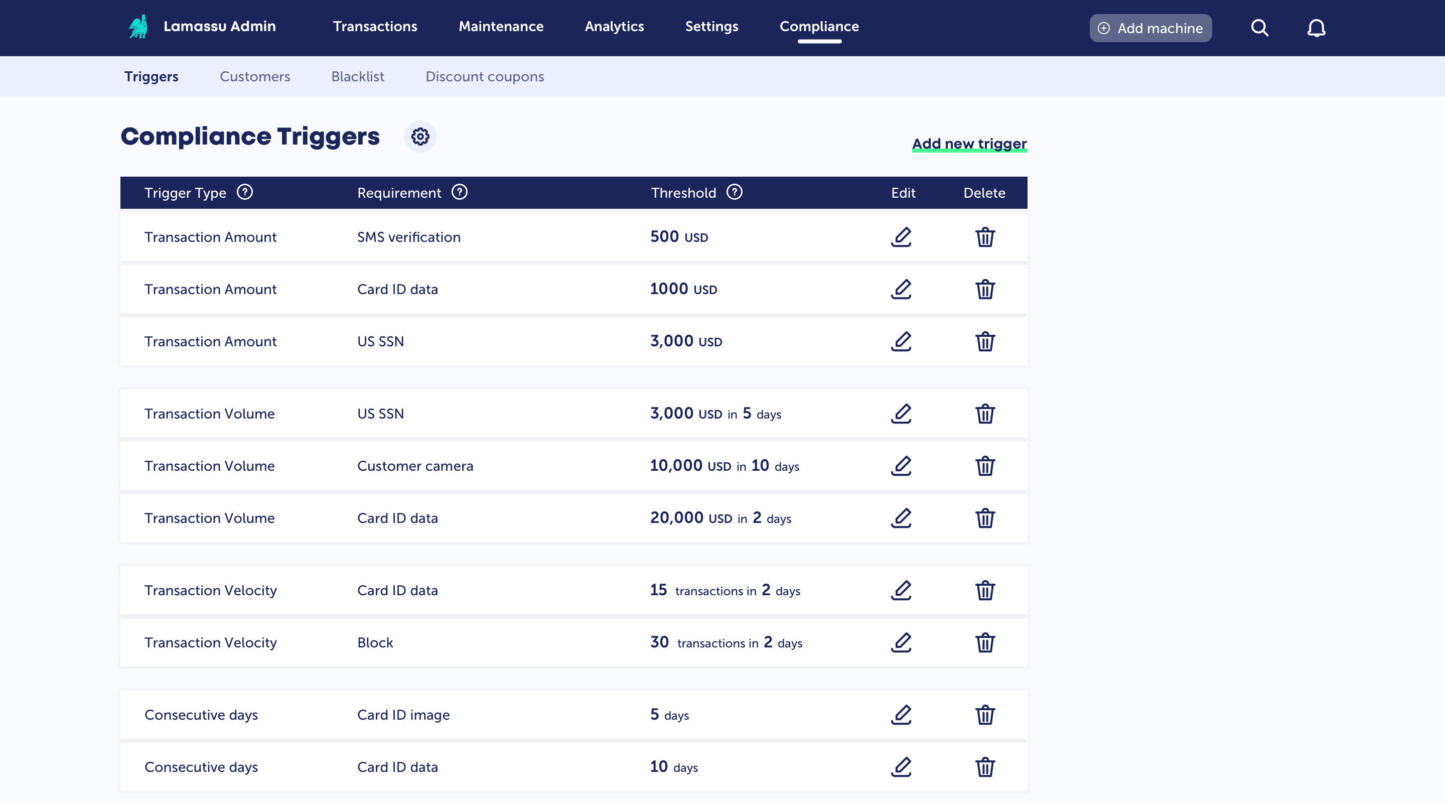 We approach compliance in two ways. The first is to strip the complexity and bureaucracy from the user interface. The second is to give the operator all of the tools necessary to power their complete compliance plan, regardless of the jurisdiction. We do this by analyzing the entire process from collection to application of triggers and rules to satisfy the requirements of the local regulators.